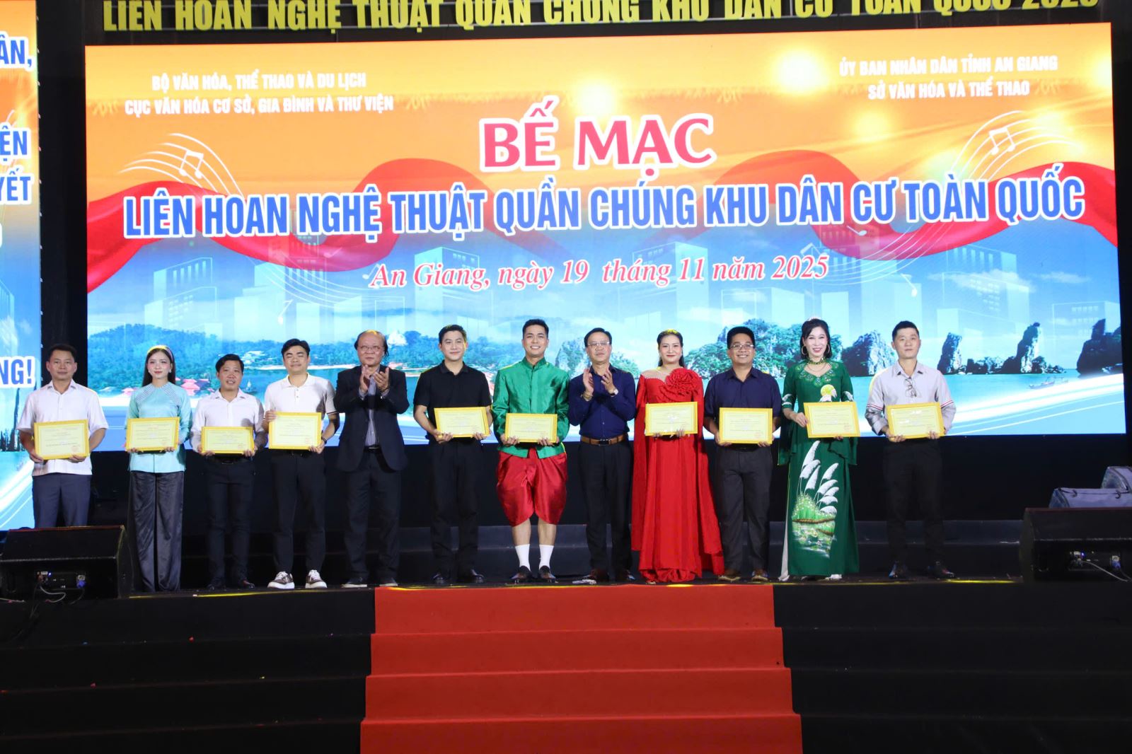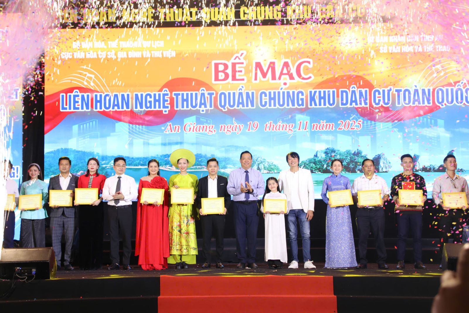 Tối 19-11, tại quảng trường Trưng Nữ Vương (phường Long Xuyên, tỉnh An Giang) Bộ VHTTDL phối hợp với UBND tỉnh An Giang tổ chức đêm công diễn và bế mạc Liên hoan Nghệ thuật quần chúng khu dân cư toàn quốc năm 2025.