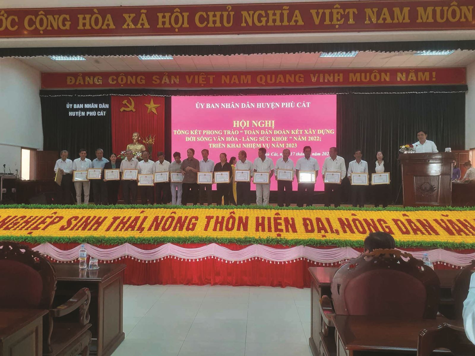 Để phong trào “TDĐKXDĐSVH- LSK” lan tỏa và nhận được sự hưởng ứng của nhân dân, hằng năm, Ban Chỉ đạo phong trào “TDĐKXDĐSVH- LSK” huyện Phù Cát đã chủ động xây dựng kế hoạch thực hiện các nội dung của phong trào; vận động cán bộ, công chức, viên chức luôn gương mẫu đi đầu trong các hoạt động; đưa tiêu chí thực hiện phong trào “TDĐKXDĐSVH” vào bình xét thi đua, đánh giá hằng năm; chỉ đạo các thôn xây dựng, sửa đổi hương ước, quy ước phù hợp với tình hình phát triển chung; Đẩy mạnh tuyên truyền, phổ biến, triển khai những tiêu chí của phong trào tới từng thôn, làng, từng hộ gia đình để nhân dân biết và thực hiện; chỉ đạo các cơ quan, hội, đoàn thể chú trọng nêu gương những người tốt việc tốt, điển hình trong các hoạt động, phong trào. Từ đó, các hội viên, các hộ gia đình có ý thức chấp hành chủ trương, đường lối của Đảng, chính sách, pháp luật của Nhà nước, tích cực tham gia xây dựng địa phương ngày càng phát triển. Kết quả, năm 2022 toàn huyện có 47.913/49.032 hộ được công nhận Gia đình văn hoá, đạt tỷ lệ 97,7% (tăng 1,6% so với năm 2021); 92% Gia đình sức khỏe;117/117 thôn, khu phố được công nhận danh hiệu Khu dân cư văn hóa; 93,2% thôn, khu phố đạt Làng sức khỏe; 80% cơ quan, đơn vị, doanh nghiệp đạt chuẩn văn hóa; tỷ lệ người dân tham gia luyện tập thể thao thường xuyên đạt 80%. Các thiết chế văn hóa từ huyện đến cơ sở được đầu tư, đáp ứng nhu cầu sinh hoạt văn hóa, văn nghệ, luyện tập thể dục thể thao của người dân… Bên cạnh đó, công tác văn hóa, văn nghệ, bảo tồn, phát huy giá trị di sản văn hóa; đẩy mạnh chuyển đổi số… cũng được quan tâm triển khai thực hiện và hoàn thành nhiệm vụ đề ra.