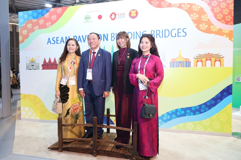 Bộ trưởng Nguyễn Văn Hùng và Cục trưởng Cục Hợp tác quốc tế, Tổng Đại diện Việt Nam tại EXPO 2025 Nguyễn Phương Hòa chụp ảnh lưu niệm ở Nhà triển lãm ASEAN
