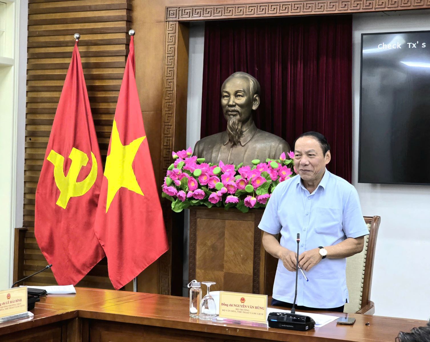 Dự Hội nghị có: Ủy viên dự khuyết Trung ương Đảng, Thứ trưởng Thường trực Lê Hải Bình; các Thứ trưởng: Tạ Quang Đông, Trịnh Thị Thủy, Hoàng Đạo Cương, Hồ An Phong, Pham Tâm, cùng lãnh đạo các cơ quan tham mưu quản lý nhà nước của Bộ VHTTDL.