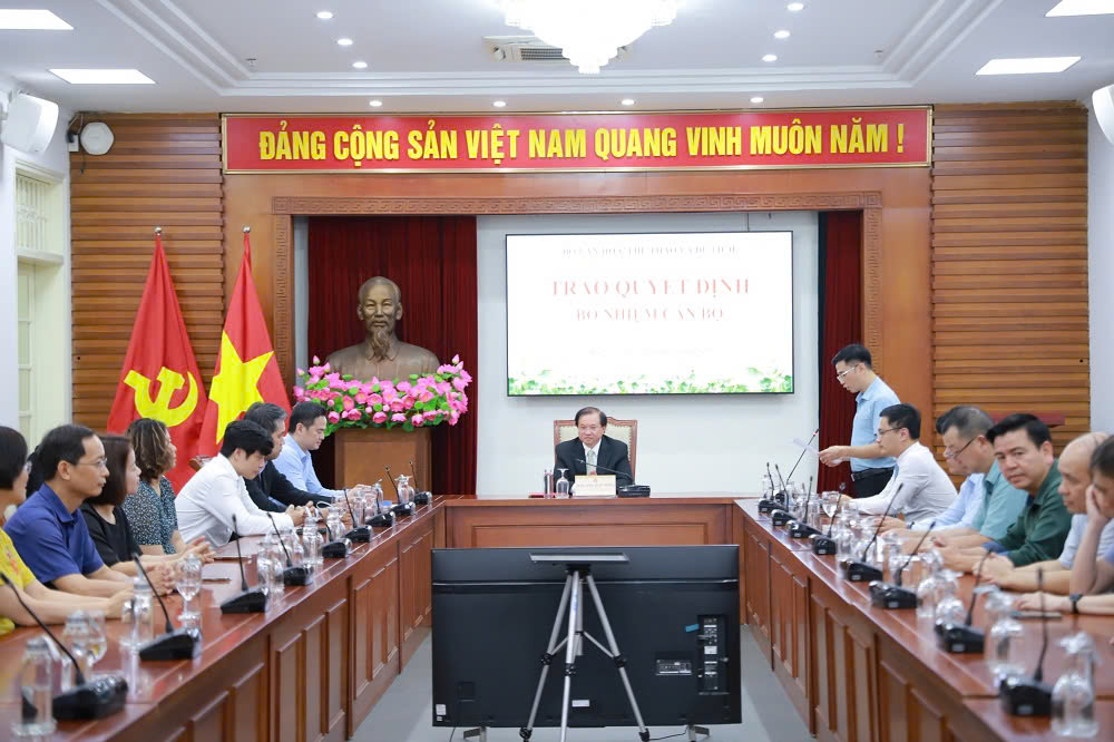 Thứ trưởng Bộ VHTTDL Tạ Quang Đông trao Quyết định bổ nhiệm cán bộ cho ông Cao Lê Tuấn Anh và Quyết định công nhận chức vụ cho NSND Đỗ Quốc Hưng (người đứng giữa)