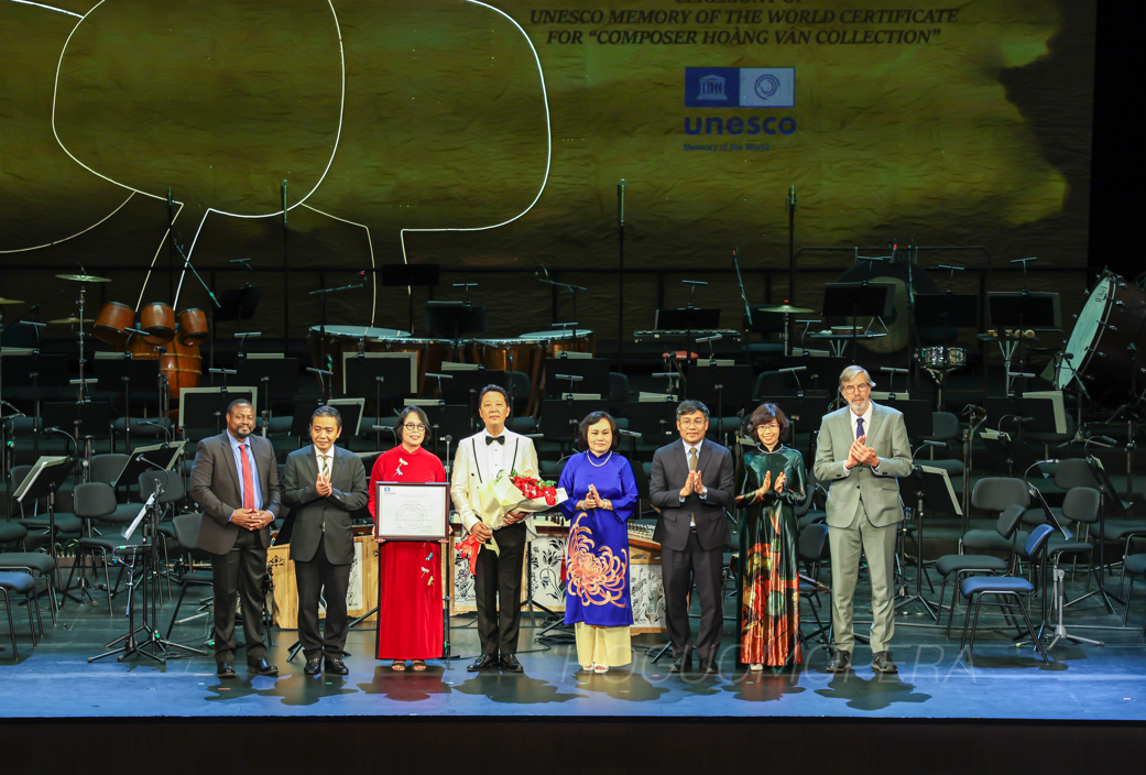 Thứ trưởng Bộ VHTTDL Hoàng Đạo Cương; TS Fackson Banda, Trưởng Bộ phận Di sản tư liệu Chương trình Ký ức thế giới của UNESCO; ông Johannes Joseph Maria Bos, Chủ tịch Hội đồng Tư vấn quốc tế Chương trình Ký ức thế giới; Thứ trưởng Bộ Ngoại giao, Chủ tịch Ủy ban Quốc gia UNESCO Việt Nam Nguyễn Minh Vũ trao chứng nhận của UNESCO cho gia đình nhạc sĩ Hoàng Vân trước khi khai mạc chương trình