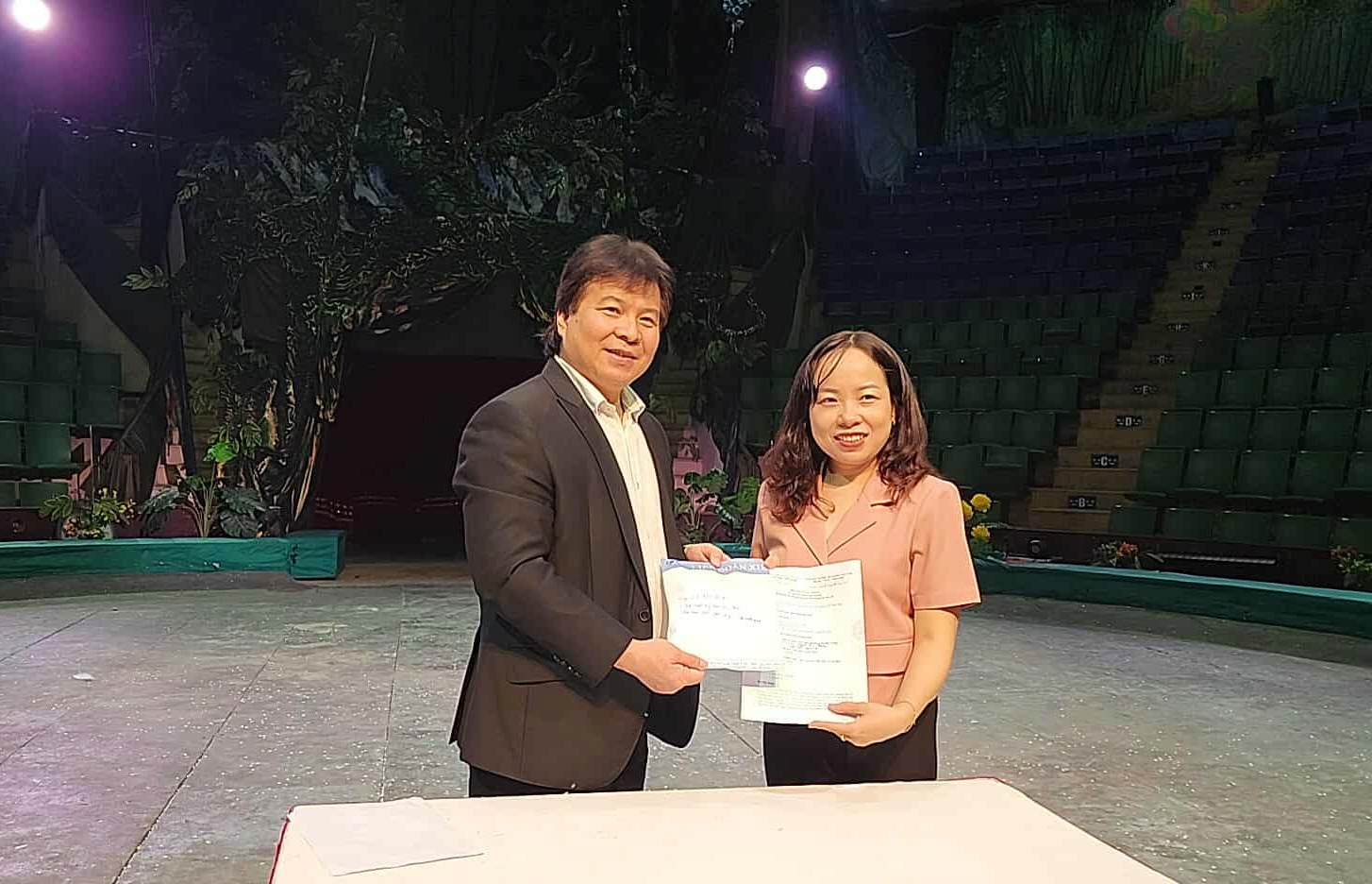 NSND Tống Toàn Thắng - Giám đốc Liên đoàn Xiếc Việt Nam trao trực tiếp số tiền quyên góp sau đêm diễn cho bà Nguyễn Hiền Phương - Chủ tịch Ủy ban Mặt trận Tổ quốc phường Hai Bà Trưng, TP.Hà Nội