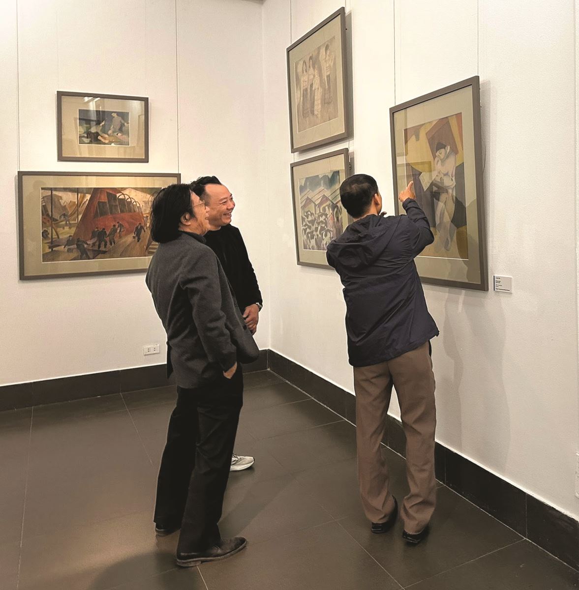 Họa sĩ Lê Anh Vân cùng các học trò bồi hồi xem lại tác phẩm của mình sáng tác 50 năm trước - Ảnh: Trần Tuyết Mai