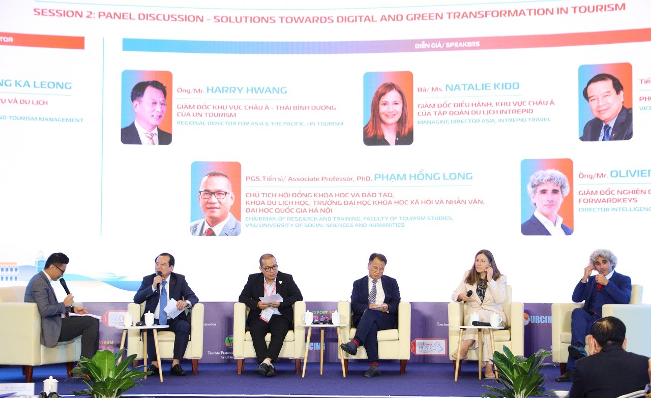 Phiên thảo luận 2: “Thảo luận giải pháp hướng tới chuyển đổi số và chuyển đổi xanh trong du lịch” đã mở rộng góc nhìn từ các chuyên gia, nhà quản lý và doanh nghiệp quốc tế, các diễn giả như TS Hà Văn Siêu - Phó Cục trưởng Cục Du lịch Quốc gia Việt Nam; PGS, TS Phạm Hồng Long - Chủ tịch Hội đồng Khoa học và Đào tạo Khoa Du lịch học, Trường Đại học Khoa học Xã hội và Nhân văn (Đại học Quốc gia Hà Nội)… về các giải pháp hướng tới chuyển đổi số và chuyển đổi xanh trong du lịch.