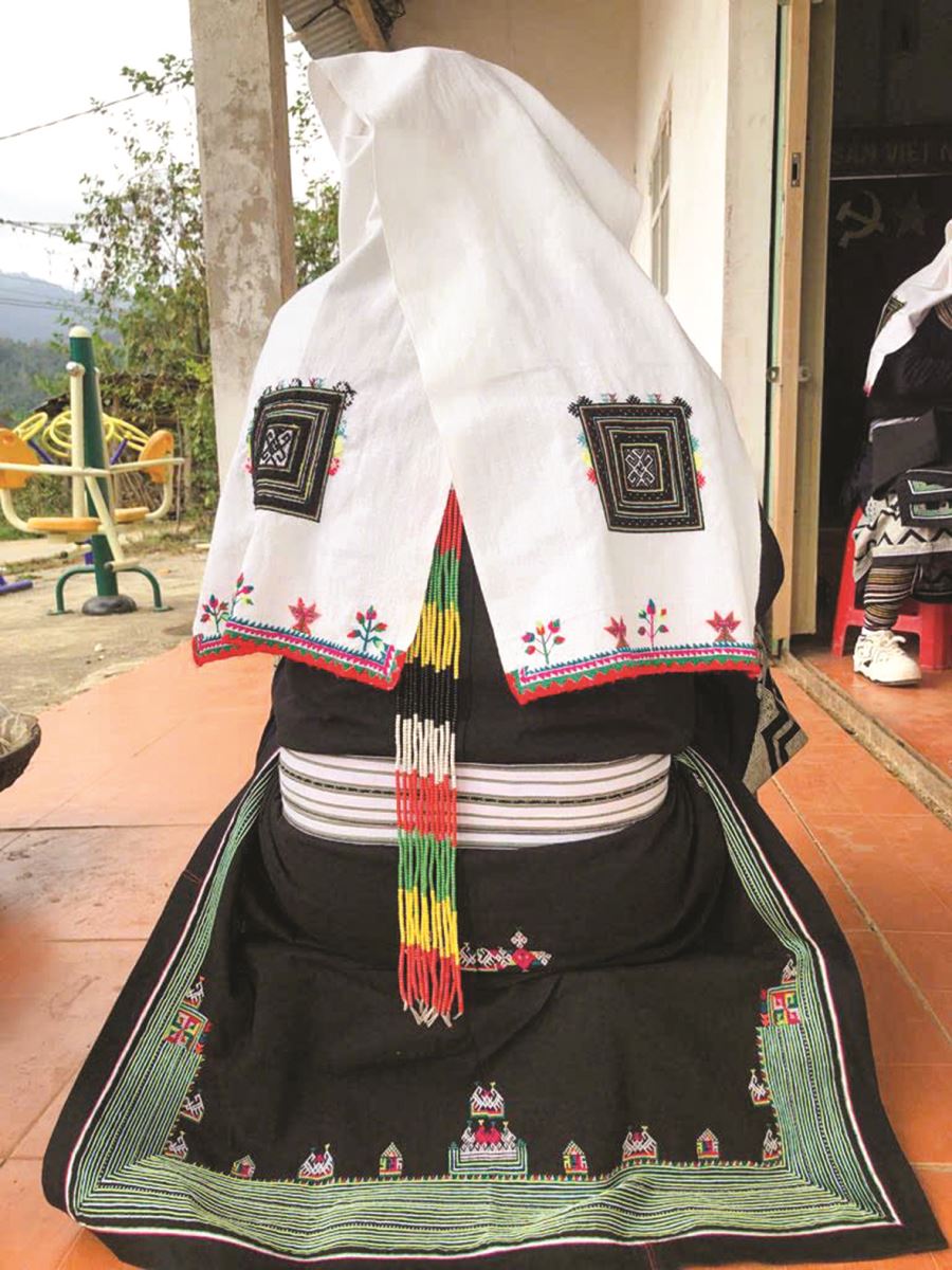 Chiếc khăn đội đầu và hoa văn trang trí trên vạt sau áo