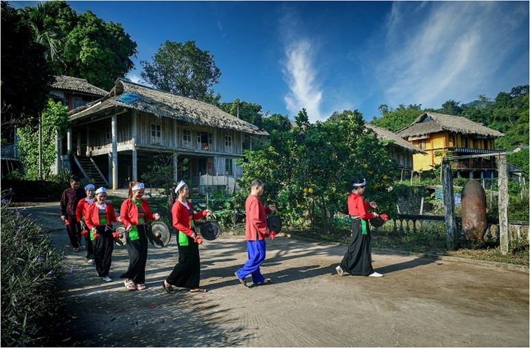 Du khách đến với Bản Giang Mỗ sẽ được trải nghiệm những bản hòa tấu cồng chiêng cùng những điệu múa truyền thống của người Mường