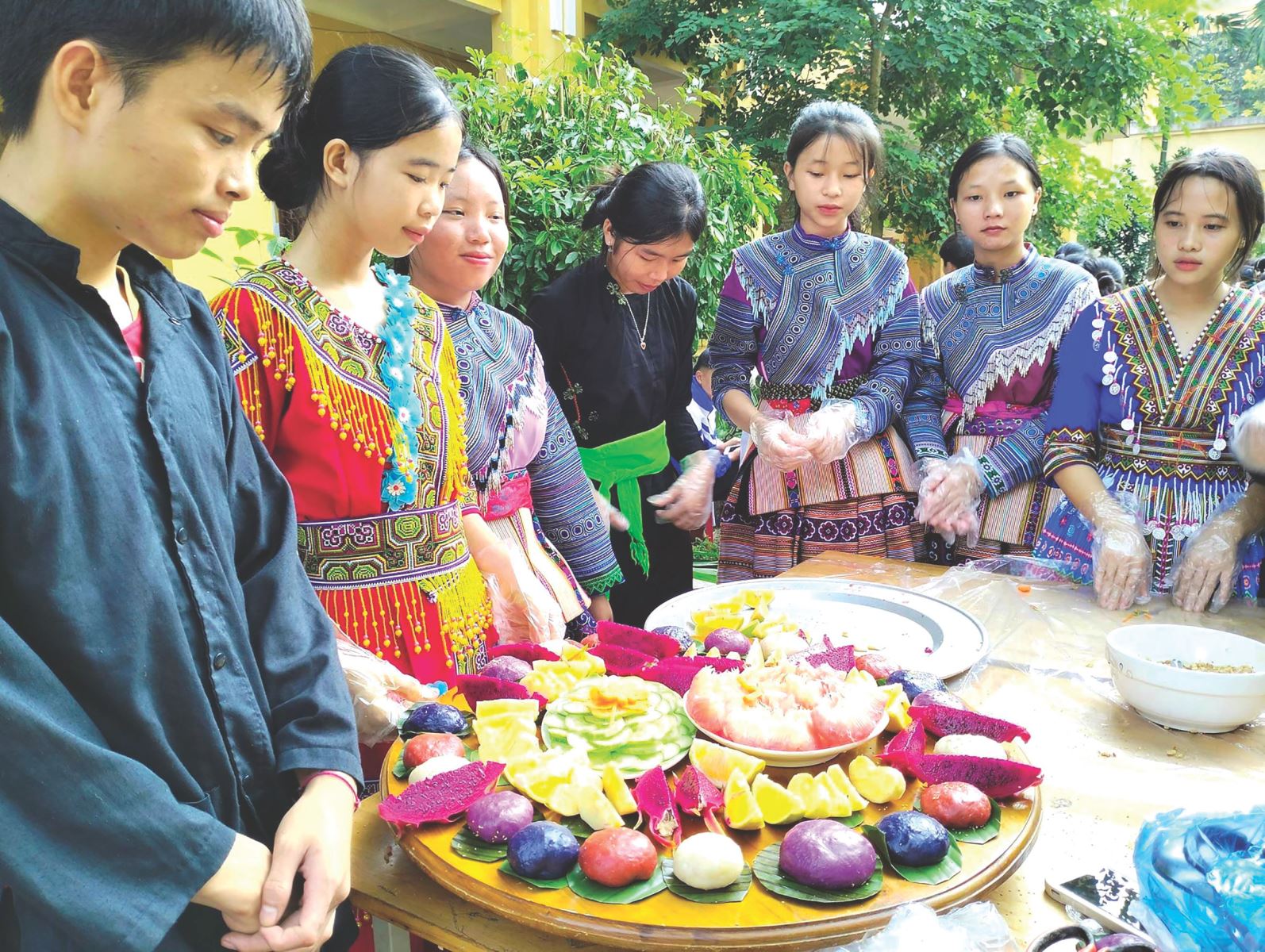 Các em học sinh trong trang phục dân tộc, tự tin giới thiệu về văn hóa ẩm thực của dân tộc mình