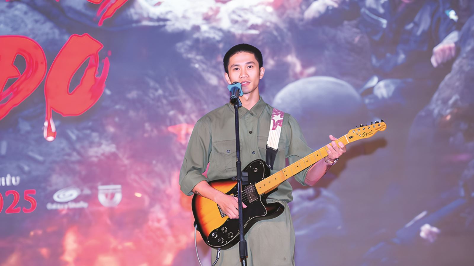 Diễn viên, nhạc sĩ Nguyễn Hùng trình bày ca khúc "Còn gì đẹp hơn" tại buổi ra mắt phim "Mưa đỏ" - Ảnh: Galaxy Studio
