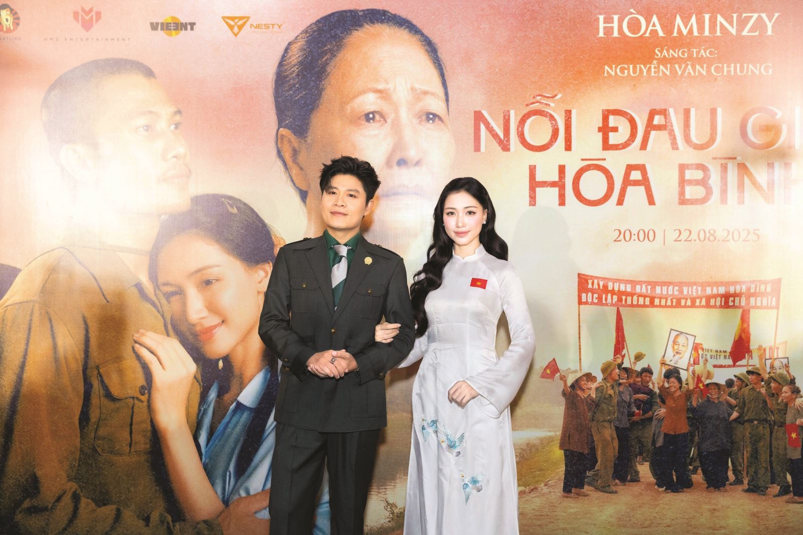 Ca sĩ Hòa Minzy và nhạc sĩ Nguyễn Văn Chung trong buổi ra mắt MV "Nỗi đau giữa hòa bình"