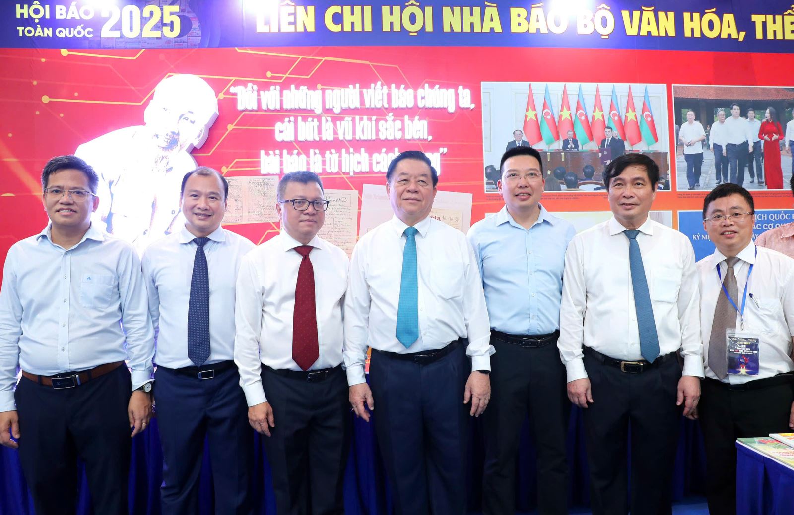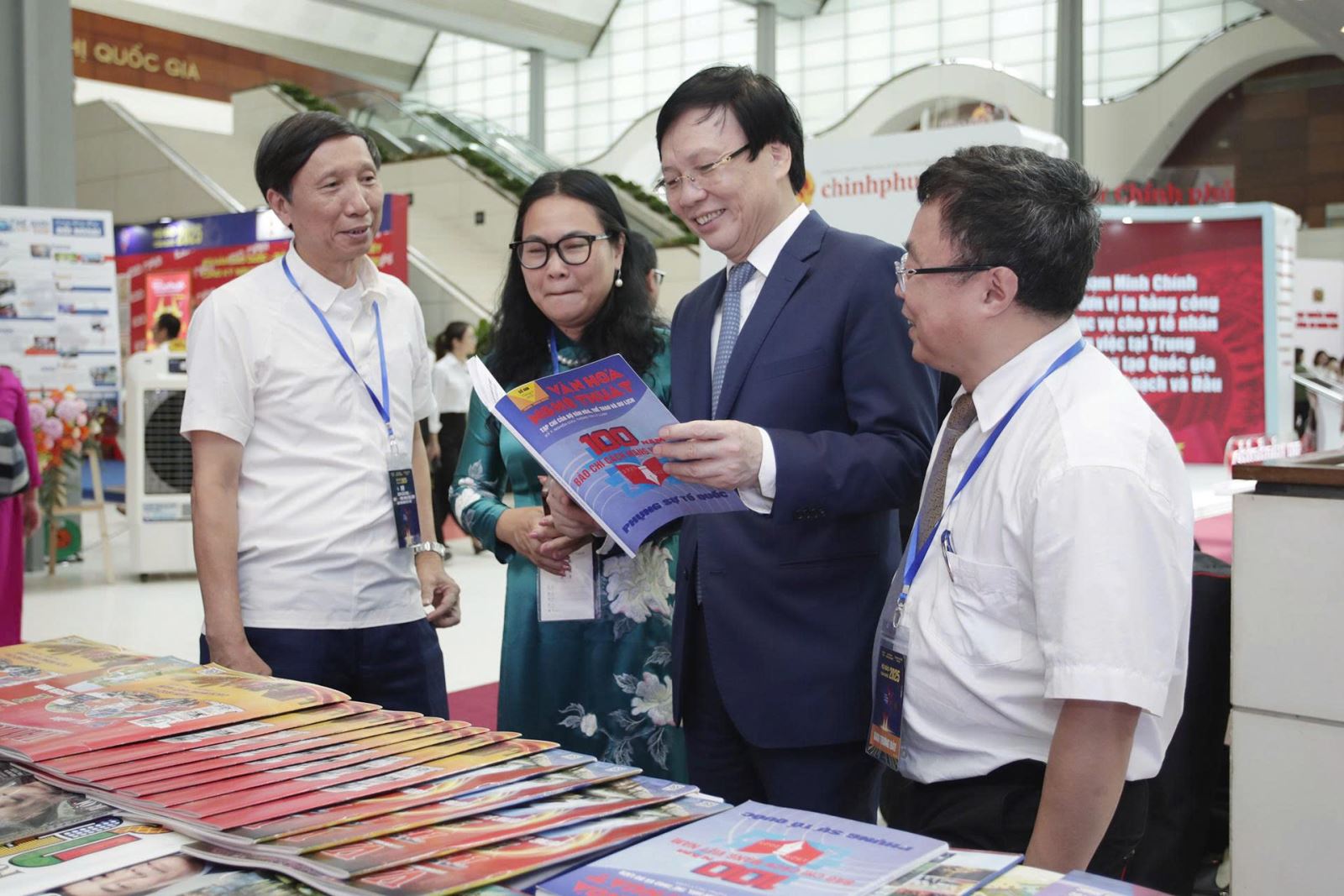 Ủy viên Bộ Chính trị, Bí thư Trung ương Đảng, Trưởng Ban Tuyên giáo và Dân vận Trung ương Nguyễn Trọng Nghĩa; Ủy viên Trung ương Đảng, Phó Trưởng Ban Tuyên giáo và Dân vận Trung ương, Chủ tịch Hội Nhà báo Việt Nam, Tổng Biên tập Báo Nhân Dân Lê Quốc Minh; Ủy viên dự khuyết Trung ương Đảng, Thứ trưởng Thường trực Bộ VHTTDL Lê Hải Bình, Phó Trưởng Ban Tuyên giáo và Dân vận Trung ương Phan Xuân Thủy thăm gian trưng bày của Liên chi Hội Nhà báo Bộ VHTTDL- Ảnh: Trần Huấn