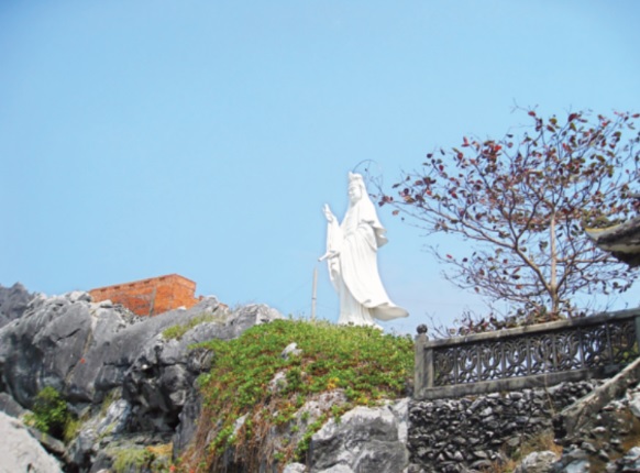 Sau hai giờ hải trình trên biển với gió cấp 3, cấp 4, tàu cập bãi Nam của Hòn Nghệ. Từ phía biển, du khách sẽ được chiêm ngưỡng bức tranh non nước hữu tình của hòn đảo xinh đẹp này. Đầu tiên là tượng Phật Bà Quan Âm cao 20m đứng uy nghi, tự tại giữa lưng chừng núi Lầu Chuông – Đây là ngọn núi đá vôi bị xâm thực nên có hình dáng đẹp, kỳ vĩ với nhiều hang động bí hiểm. Khách du sang thuyền nhỏ vào bờ. Sau mươi phút nghỉ ngơi bạn bắt đầu khám phá Hòn Nghệ.