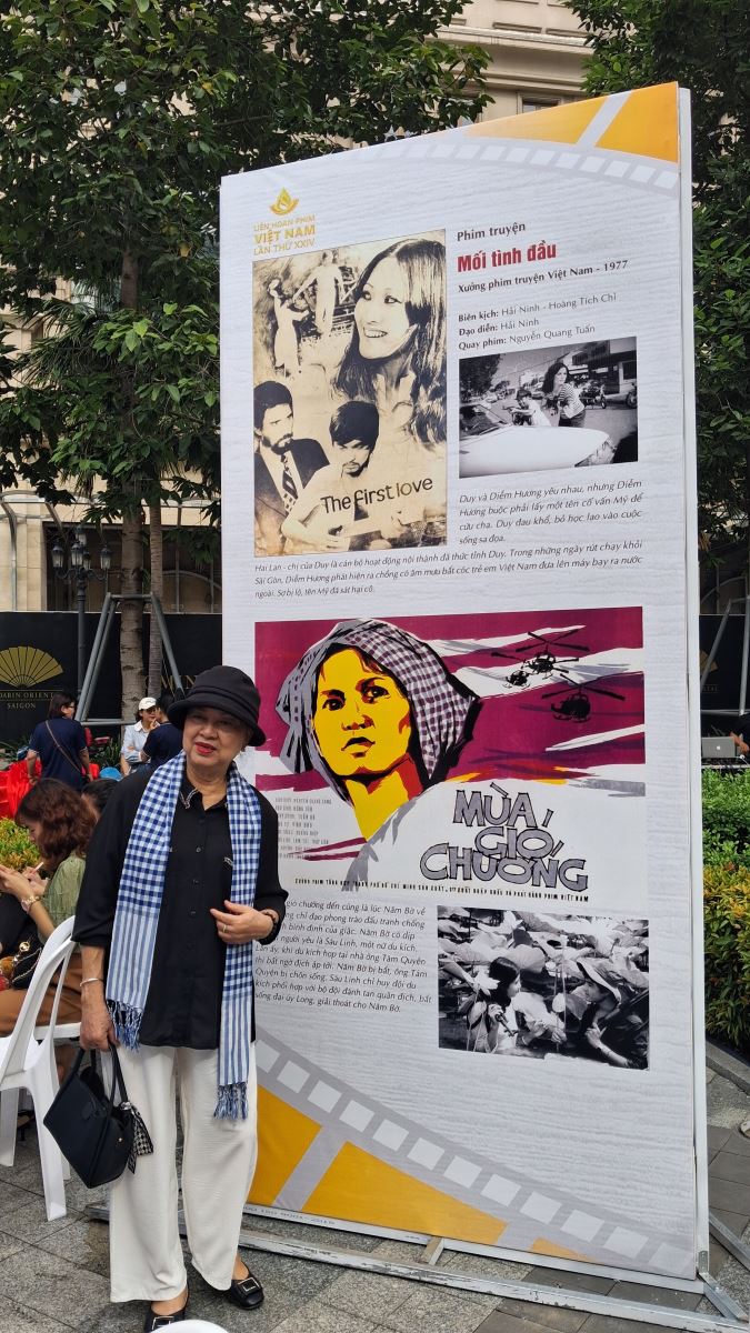 NSƯT Thùy Liên bên tấm ảnh áp phích phim "Mùa gió chướng" mà bà đóng vai chính trưng bày tại Triển lãm