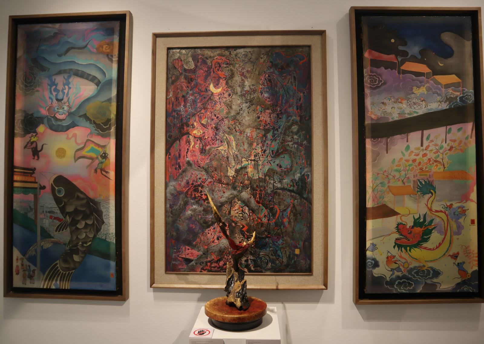 Tác phẩm điêu khắc và tranh sơn mài "Tựa sơn vọng thủy" của tác giả Bùi Kim Hiền