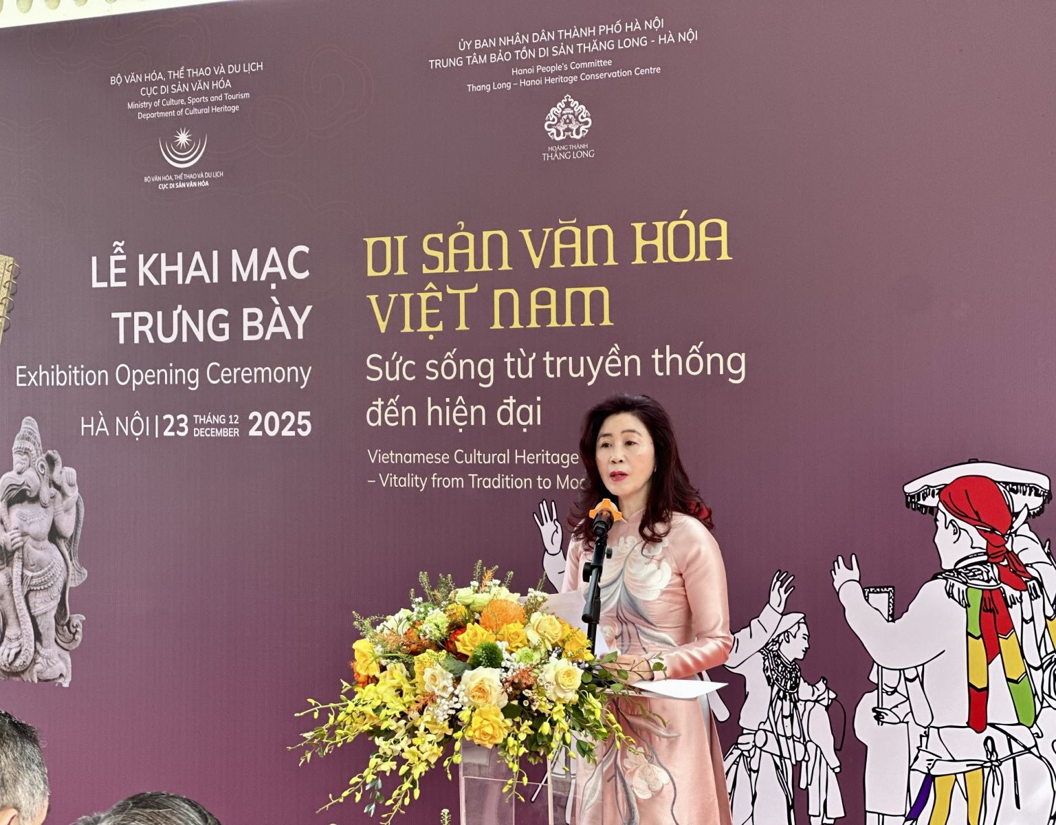 Cũng tại lễ khai mạc, Cục trưởng Cục Di sản văn hóa Lê Thị Thu Hiền cho biết, trưng bày “Di sản văn hóa Việt Nam – Sức sống từ truyền thống đến hiện đại” là hoạt động tiếp nối chuỗi sự kiện kỷ niệm Ngày Di sản văn hóa Việt Nam, có ý nghĩa quan trọng trong việc tôn vinh các giá trị lịch sử, văn hóa truyền thống của dân tộc. Đồng thời, đây cũng là hoạt động thiết thực chào mừng Đại hội Đại biểu toàn quốc lần thứ XIV của Đảng. Theo Cục trưởng Lê Thị Thu Hiền, trưng bày góp phần giới thiệu một cách sinh động, trực quan tới công chúng trong nước và quốc tế về những giá trị tiêu biểu của di sản văn hóa Việt Nam, phản ánh những kết quả nổi bật đạt được trong công tác bảo vệ và phát huy giá trị di sản văn hóa vật thể, phi vật thể, di sản tư liệu cũng như hoạt động của hệ thống bảo tàng trong thời gian qua.