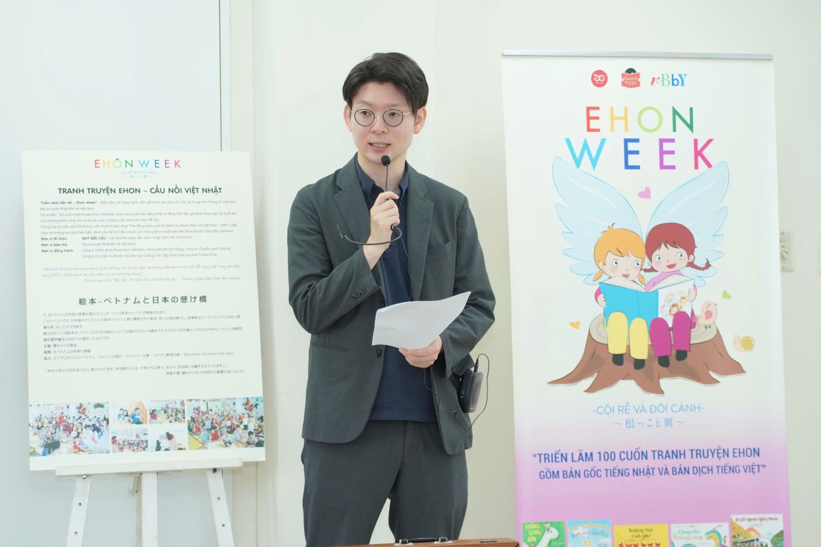 Phát biểu tại lễ khai mạc, ông Ogasawara Manabu, Bí thư thứ 3, Trưởng Ban Văn hóa - Báo chí, Đại sứ quán Nhật Bản tại Việt Nam cho biết: “Tuần sách kết nối - Ehon Week được tổ chức lần đầu tiên vào năm 2023 nhân kỷ niệm 50 năm thiết lập quan hệ ngoại giao giữa Nhật Bản và Việt Nam. Khi đó có hơn một nghìn bố mẹ và các con đã đến với Trung tâm thông tin văn hóa. Tôi thực sự ấn tượng khi chứng kiến việc các bạn nhỏ vô cùng vui sướng khi được cầm trên tay các cuốn truyện tranh Ehon và đọc say sưa. Sự kiện năm nay được tổ chức kéo dài 14 ngày. Tôi hết sức vui mừng vì năm nay hoạt động giao lưu văn hóa Nhật - Việt thông qua tranh truyện có ý nghĩa này lại tiếp tục được tổ chức. Một trăm cuốn truyện tranh Nhật Bản dịch sang tiếng Việt được trưng bày và bên cạnh đó còn có không gian để các em nhỏ có thể thoải mái đọc truyện tại đây. Tôi mong rằng thông qua trải nghiệm về tranh truyện Nhật Bản, các em nhỏ - thế hệ tương lai của Việt Nam sẽ trở nên gần gũi với tranh truyện, nuôi dưỡng trí tưởng tượng phong phú và mở rộng thêm thế giới quan của mình”.