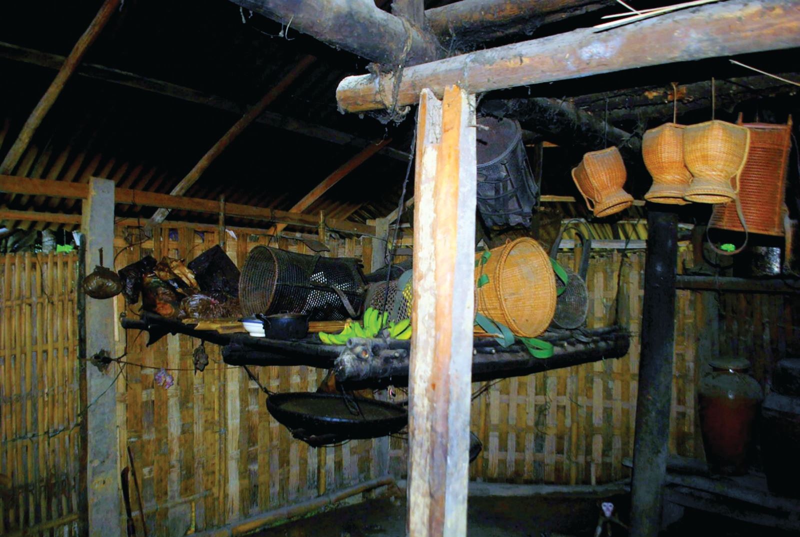 Các dụng cụ đan lát bằng mây tre hong trên gác bếp