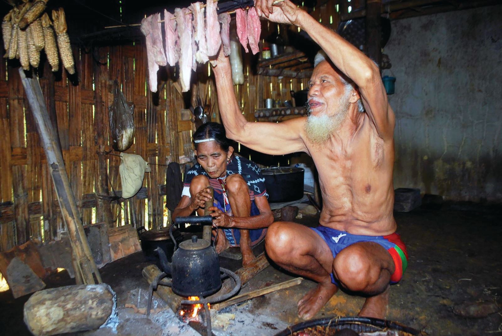 Người già Cơ Tu treo thịt heo xông khói trên gác bếp