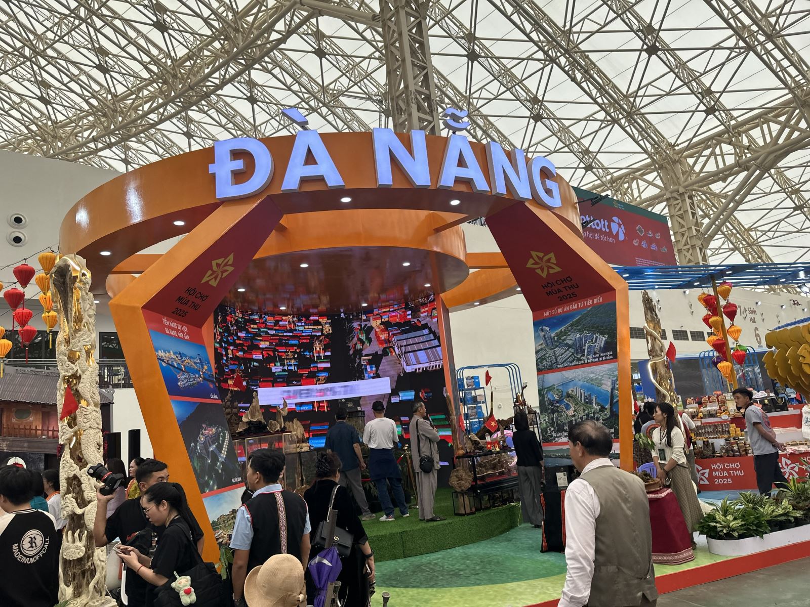 Bên cạnh đó, Đà Nẵng - “thành phố đáng sống”, mang đến hình ảnh năng động với tông cam rực rỡ và không gian mở. Các màn hình LED lớn trình chiếu cảnh quan sông Hàn, bán đảo Sơn Trà, bãi biển Mỹ Khê cùng các khu đô thị hiện đại, gợi nên một đô thị biển trẻ trung, thân thiện, hấp dẫn du khách và nhà đầu tư. Gian hàng Đà Nẵng cũng thu hút đông đảo người xem nhờ các sản phẩm du lịch, thủ công mỹ nghệ và hải sản khô đặc trưng miền Trung.
