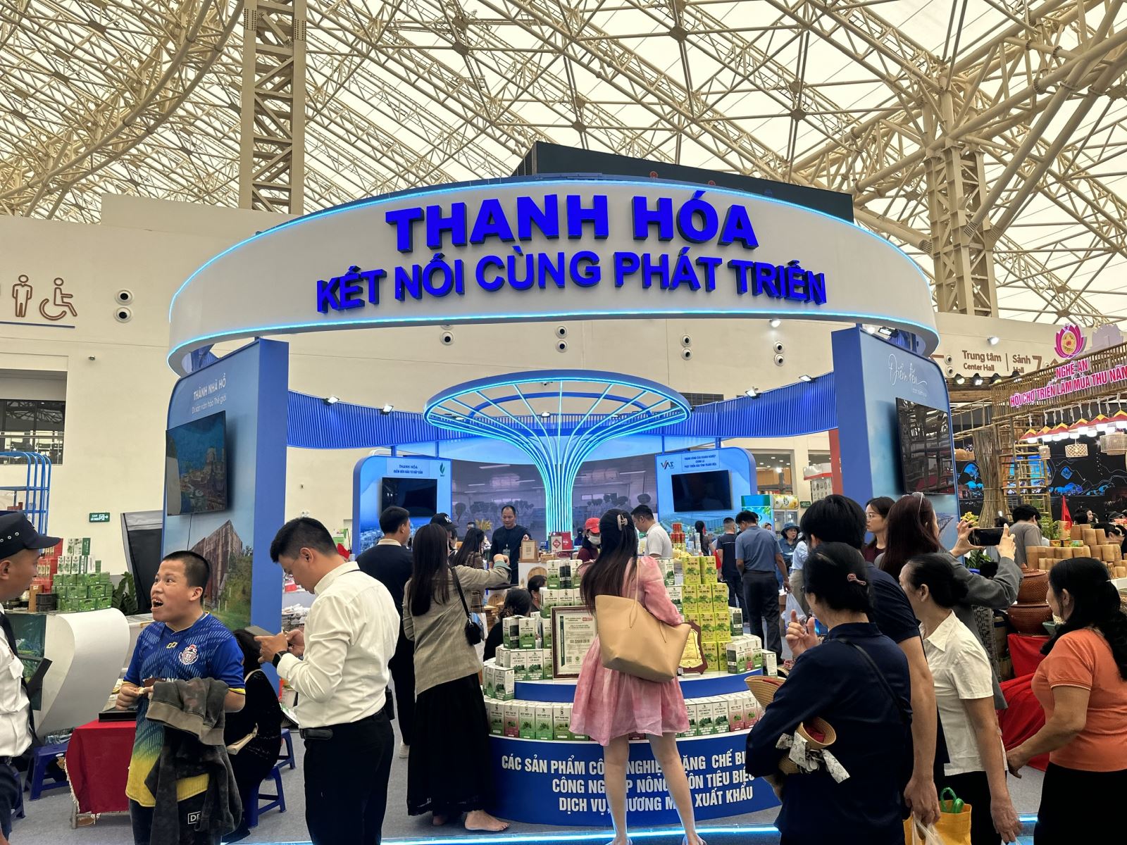 Khu trưng bày của Thanh Hóa gây ấn tượng bởi thiết kế hiện đại, lấy gam xanh làm chủ đạo với thông điệp “Kết nối cùng phát triển”. Gian hàng trưng bày đa dạng các sản phẩm công nghiệp chế biến, nông sản tiêu biểu và sản phẩm OCOP, từ mật ong, dược liệu đến đặc sản biển Sầm Sơn. Không khí giao thương sôi nổi khi du khách, doanh nghiệp và người dân cùng trao đổi, tìm hiểu về tiềm năng của vùng đất xứ Thanh - nơi đang chuyển mình mạnh mẽ giữa truyền thống và công nghiệp hiện đại.