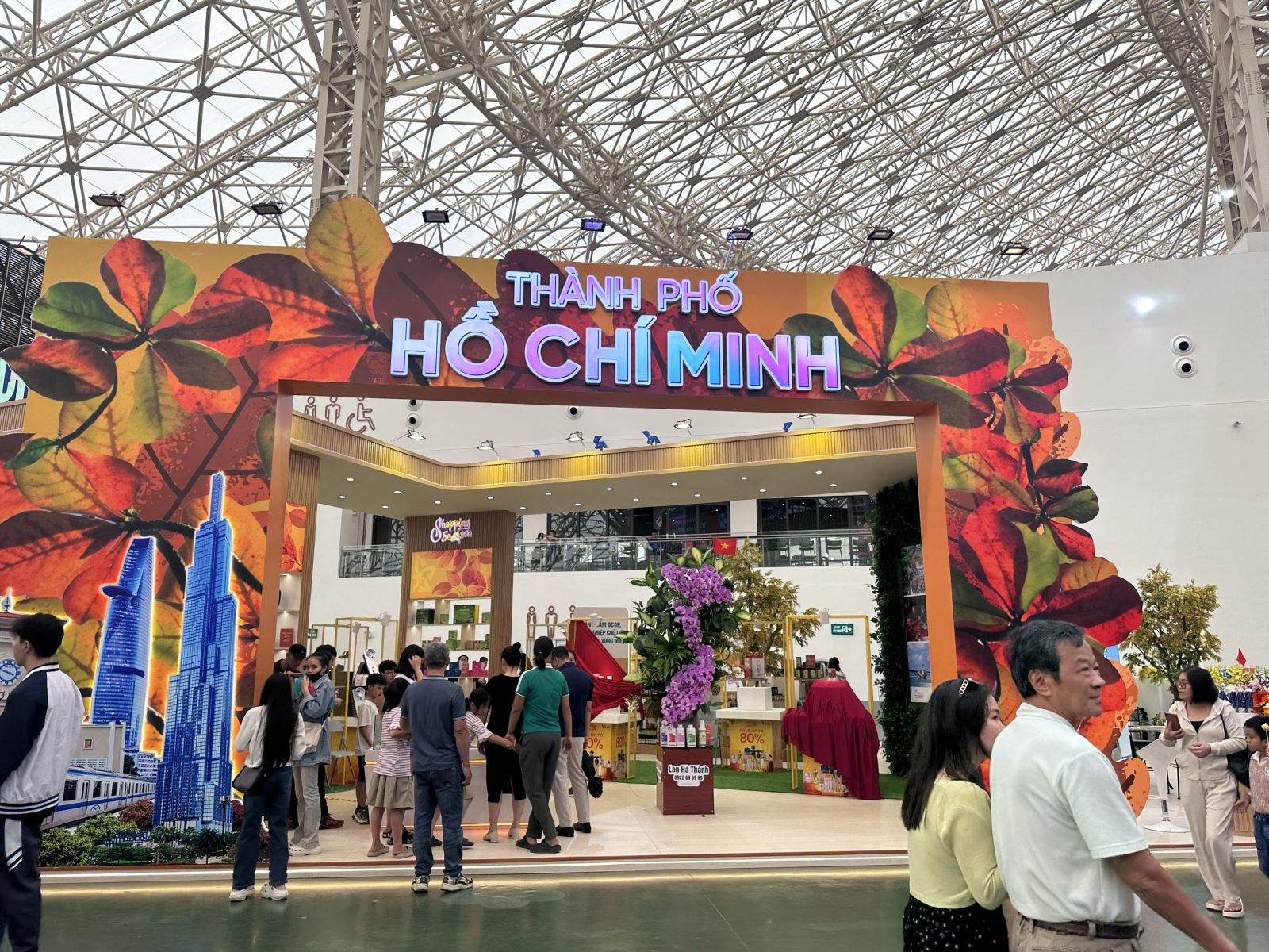 Trong khi đó, không gian của TP.HCM lại mang đến một cảm giác khác: hiện đại, trẻ trung và tràn ngập sắc màu. Thiết kế gian hàng nổi bật với hình ảnh tòa Landmark 81, tuyến metro cùng sắc cam và đỏ rực rỡ của những chiếc lá mùa thu, biểu trưng cho năng lượng sáng tạo và sức sống đô thị. Du khách có thể tìm thấy ở đây các sản phẩm đặc trưng của thành phố như cà phê, thủ công mỹ nghệ, mỹ phẩm thiên nhiên, tất cả được giới thiệu trong không gian mang hơi thở của “thành phố không ngủ”.