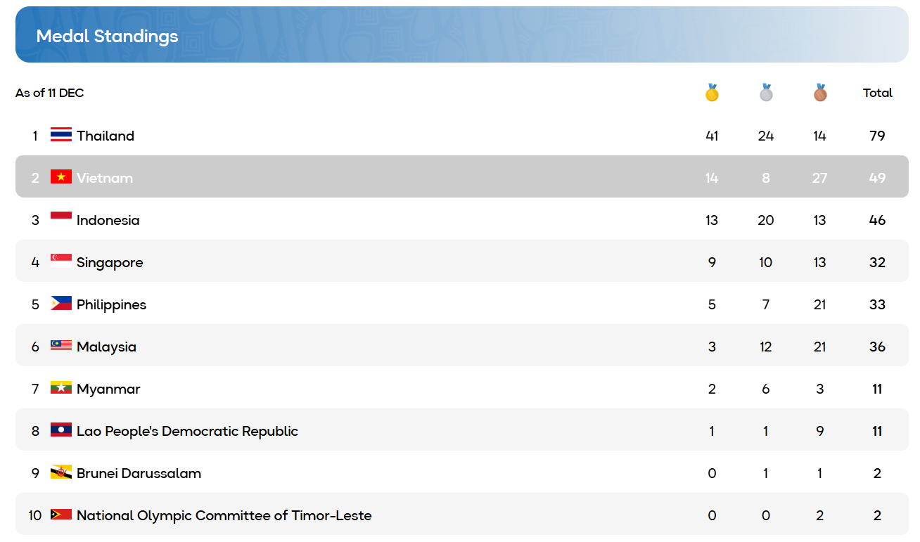 Ngày 11-12, người hâm mộ đã được chứng kiến một ngày thi đấu thành công của đoàn thể thao Việt Nam khi mang về thêm 10 HCV, 4 HCB, 9 HCĐ, vươn lên đứng thứ 2 sau đoàn thể thao chủ nhà Thái Lan.