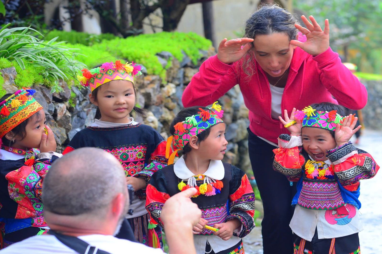 Những em bé Lô Lô tạo dáng chụp ảnh cùng du khách nước ngoài - Ảnh: MP