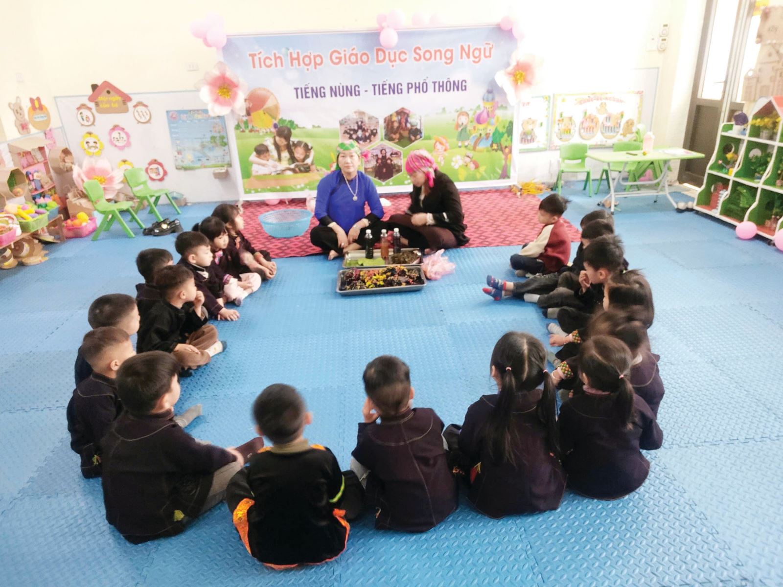 Từ khi nhận công tác tại trường, phần lớn học sinh trong lớp cô là con em dân tộc thiểu số, (đồng bào người Nùng, chiếm 70% dân số) nhưng đa số các em không biết nghe, không biết nói, thậm chí có một số phụ huynh trẻ cũng” bất khả tri: tiếng dân tộc Nùng. Thế là cô bản thân luôn nghĩ phải làm một cái gì đó để góp phần củng cố, gìn giữ tiếng nói mẹ đẻ. Về chuyên môn,bậc giáo dục mầm non chưa có văn bản hướng dẫn dạy lồng ghép song ngữ, chưa có mục tiêu, tiền lệ nào cụ thể để tuyên truyền có hiệu quả tới phụ huynh. Song cô nghĩ là làm, bởi học sinh lớp mầm non học và ăn nghỉ tại trường. Cô thường xuyên nói tiếng Nùng với trẻ, ngày nào cũng như ngày nào, đến hết năm học, trẻ cũng biết giao tiếp một số câu cơ bản. Tuy nhiên, cô cũng gặp những khó khăn, một số phụ huynh mang tư tưởng “Không biết tiếng phổ thông mới sợ, chứ tiếng dân tộc không biết thì chả làm sao”. Vậy là cô đề nghị cho họp phụ huynh để làm công tác tuyên truyền những nghị quyết Trung ương về “Xây dựng và phát triển nền văn hóa Việt Nam tiên tiến đậm đà bản sắc dân tộc” và “Xây dựng và phát triển văn hóa, con người Việt Nam gắn với việc phát triển bền vững của đất nước”… Mưa dầm thấm lâu, Cô chuyển hóa được nhận thức của chính các phụ huynh. Cánh diều bảo tồn văn hóa dân tộc của cô gặp được thêm luồng gió mới từ năm học 2021-2022, Sở Giáo dục có văn bản về việc “Tăng cường giáo dục song ngữ cho trẻ mầm non và tiểu học trên cơ sở tiếng mẹ đẻ” Cô được nhà trường cử tham gia các lớp tập huấn do ngành Giáo dục tổ chức, được nhà trường phân công phụ trách lớp có nhiều con em dân tộc, lấy đó làm mục tiêu đặt ra cho kế hoạch giáo dục. Cô tăng cường tuyên truyền tới các bậc phụ huynh trên các nền tảng facebook, zalo, họp phụ huynh để thống nhất cách dạy trẻ, được phụ huynh và cộng đồng hưởng ứng. Từ đó, các bậc phụ huynh tự nguyện mang những phụ kiện, trang phục như mũ, áo, yếm, vải thêu của dân tộc tới tặng lớp để trang trí góc văn hóa dân tộc. Trẻ đến lớp chào cô, chào bố mẹ, chào bạn, mời cô, các bạn ăn cơm... bằng tiếng dân tộc Nùng. Các hoạt động tại lớp được lên kế hoạch rõ ràng và tích hợp một cách nhẹ nhàng. Cô còn phối hợp với phụ huynh dịch một số bài thơ, bài hát bằng tiếng Nùng để dạy trên lớp và học khi ở nhà. Kết quả, cuối năm học 2024 và 2025 học sinh của cô đã biết nói, biết nghe và giao tiếp bằng tiếng Nùng. Hiện, cô tham gia và giữ chức Phó Chủ nhiệm CLB hát dân ca Nùng của xã, thường xuyên giao lưu và đưa các cháu tham gia Ngày hội văn hóa các dân tộc,các hội thi, hội diễn nghệ thuật quần chúng giành nhiều giải thưởng, được nhà trường và các phụ huynh tin tưởng. Đặc biệt, trong kỳ thi Giáo viên dạy giỏi 2023 – 2025 cô mạnh dạn đưa sáng kiến: “Bảo tồn văn hóa dân tộc Nùng trên cơ sở tiếng mẹ đẻ tại lớp 4TB3” được đánh giá cao.