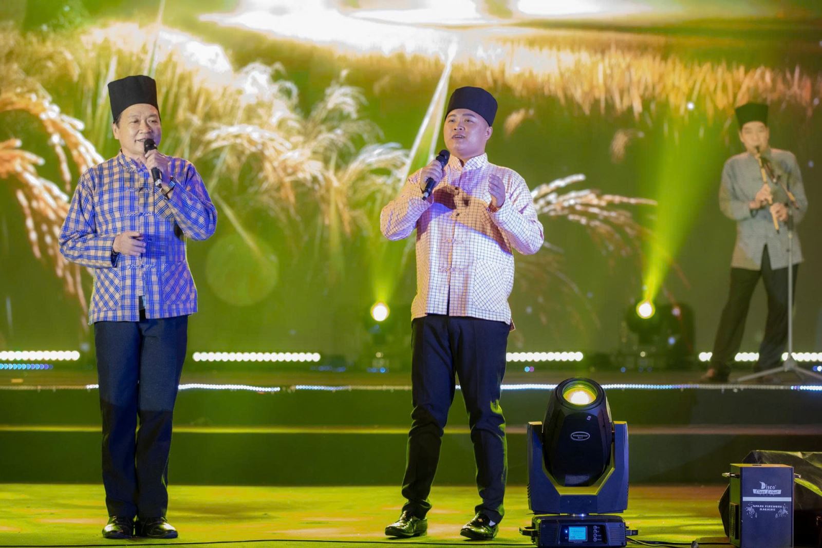 NNƯT Đinh Quang Chưởng (bên trái) biểu diễn trên sân khấu Ngày hội Văn hóa Mường lần thứ II, năm 2025