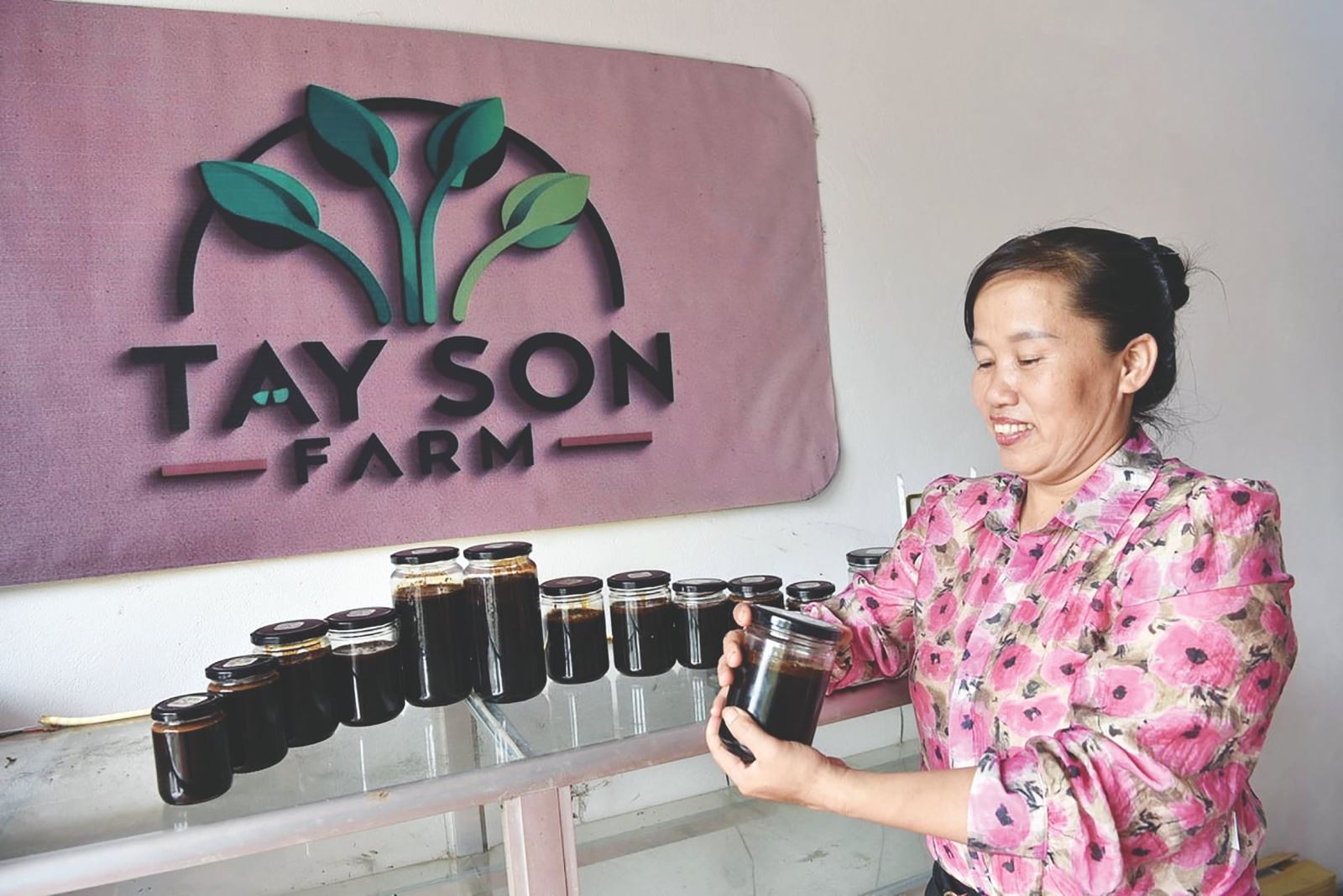 Chị còn sáng tạo trong cách tiếp cận thị trường khi học cách livestream, bán hàng trực tuyến trên mạng xã hội, giới thiệu các sản phẩm mang thương hiệu “Tây Sơn Farm” như cao Ba kích, tinh bột sắn, dược liệu khô. Doanh thu mỗi năm của gia đình chị đạt khoảng 800 triệu đồng, tạo việc làm ổn định cho nhiều lao động địa phương.