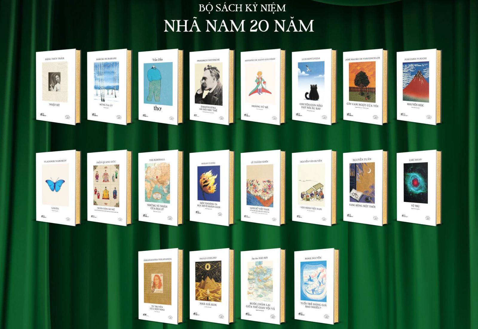 | Bộ sách phiên bản giới hạn kỷ niệm 20 năm Nhã Nam gồm 20 tác phẩm: Nhật ký Đặng Thùy Trâm (Đặng Thùy Trâm), Rừng Na Uy (Haruki Murakami, dịch giả Trịnh Lữ), Khuyến học (Fukuzawa Yukichi, dịch giả Phạm Hữu Lợi), Trần Dần – Thơ (Trần Dần), Zarathustra đã nói như thế (Friedrich Nietzsche, dịch giả Trần Xuân Kiêm), Chuyện con mèo dạy hải âu bay (Luis Sepulveda, dịch giả Phương Huyên), Vũ trụ (Carl Sagan, dịch giả Nguyễn Việt Long), Lolita (Vladimir Nabokov), Ngàn năm áo mũ (Trần Quang Đức), Hoàng tử bé (Antoine de Saint-Exupéry, dịch giả Trác Phong), Nhà giả kim (Paulo Coelho, dịch giả Lê Chu Cầu), Vang bóng một thời (Nguyễn Tuân), Tự truyện của một Yogi (Paramahansa Yogananda, dịch giả Thiên Nga), Lịch sử Việt Nam từ nguồn gốc đến giữa thế kỷ XX (Lê Thành Khôi, dịch giả Nguyễn Nghị, người hiệu đính Nguyễn Thừa Hỷ), Tuổi trẻ đáng giá bao nhiêu (Rosie Nguyễn), Bước chậm lại giữa thế gian vội vã (Hae Min, dịch giả Nguyễn Việt Tú Anh), Văn minh Việt Nam (Nguyễn Văn Huyên, dịch giả Đỗ Trọng Quang), Những tù nhân của địa lý (Tim Marshall, dịch giả Phan Linh Lan), Cây cam ngọt của tôi (Jose Mauro de Vasconcelos, dịch giả Nguyễn Bích Lan), Một thoáng ta rực rỡ ở nhân gian (Ocean Vương, dịch giả Khánh Nguyên). |