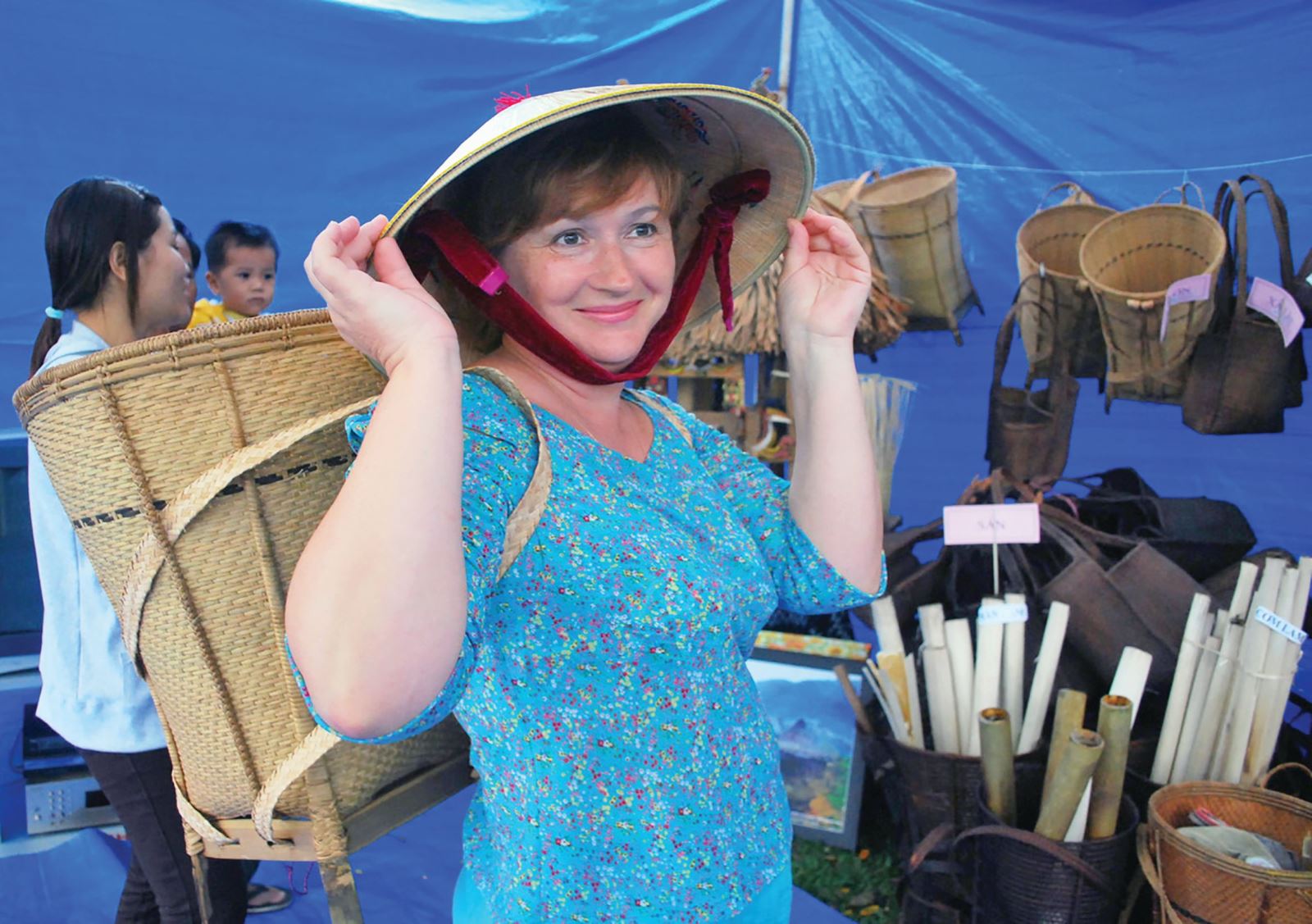 Du khách Nga rất thích thú sau khi tìm hiểu về gùi thì mang gùi để check-in