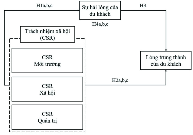 Trong bối cảnh du lịch bền vững, các nghiên cứu cho thấy CSR có tác động tích cực đến lòng trung thành của du khách. CSR môi trường, qua quản lý chất thải, tiết kiệm tài nguyên, năng lượng tái tạo và bảo vệ hệ sinh thái, nâng cao hình ảnh doanh nghiệp và khuyến khích hành vi quay lại. CSR xã hội, thông qua hỗ trợ cộng đồng, bảo tồn văn hóa và phúc lợi lao động, tăng cường sự đồng cảm và gắn kết cảm xúc với thương hiệu. CSR quản trị, gắn với minh bạch, đạo đức và tuân thủ pháp luật, tạo nền tảng niềm tin, công bằng và an toàn, từ đó củng cố lòng trung thành. Ngoài ra, Jackson nhấn mạnh vai trò quản trị nội bộ, như hội đồng độc lập và phân tách lãnh đạo, trong việc nâng cao hiệu quả CSR và cảm nhận xã hội của du khách. Trên cơ sở đó, nghiên cứu này đề xuất 3 giả thuyết nghiên cứu: H2a: CSR môi trường có tác động tích cực đến lòng trung thành của du khách; H2b: CSR xã hội có tác động tích cực đến lòng trung thành của du khách; H2c: CSR quản trị có tác động tích cực đến lòng trung thành của du khách.