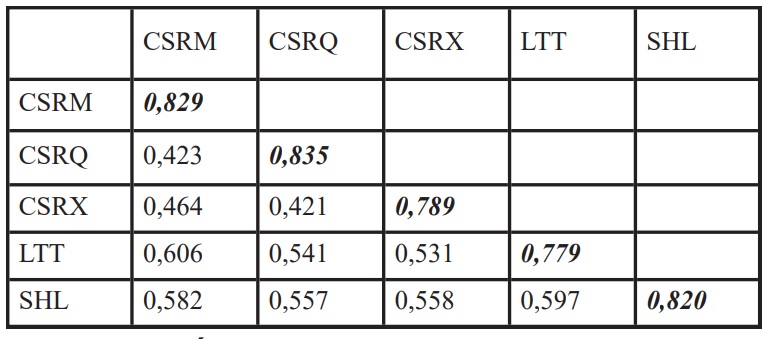 Kết quả cho thấy tất cả các thang đo có AVE dao động từ 0,607 đến 0,698, đều lớn hơn 0,5. Đồng thời, hệ số tải ngoài của các biến quan sát đều vượt ngưỡng 0,7. Điều này cho thấy thang đo đạt yêu cầu về giá trị hội tụ và không cần loại bỏ biến quan sát nào trong quá trình đo lường theo tiêu chí của Fornell và Larcker.