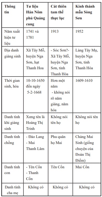 Tác giả Nguyễn Thị Yên trong quá trình khảo sát các tài liệu thành văn: tư liệu Hán Nôm phủ Quảng Cung, Cát thiên tam thế thực lục, Kinh thánh Mẫu Sòng Sơn, đã đưa ra thông tin về giáng sinh của Mẫu ở Tây Mỗ như sau:
