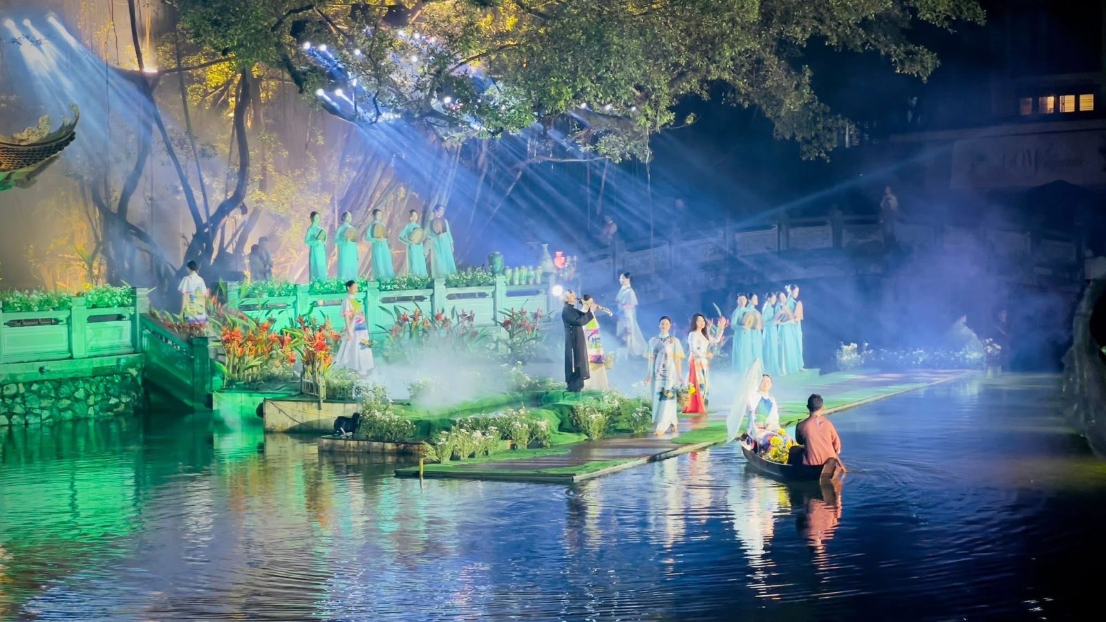 Không gian trình diễn được dàn dựng công phu với hiệu ứng ánh sáng chiếu rọi mặt nước hồ Văn, tạo nên một khung cảnh thơ mộng và tràn đầy cảm xúc, giúp khán giả cảm nhận rõ hơn vẻ đẹp văn hóa và tính nghệ thuật của tà áo dài trong môi trường di sản.