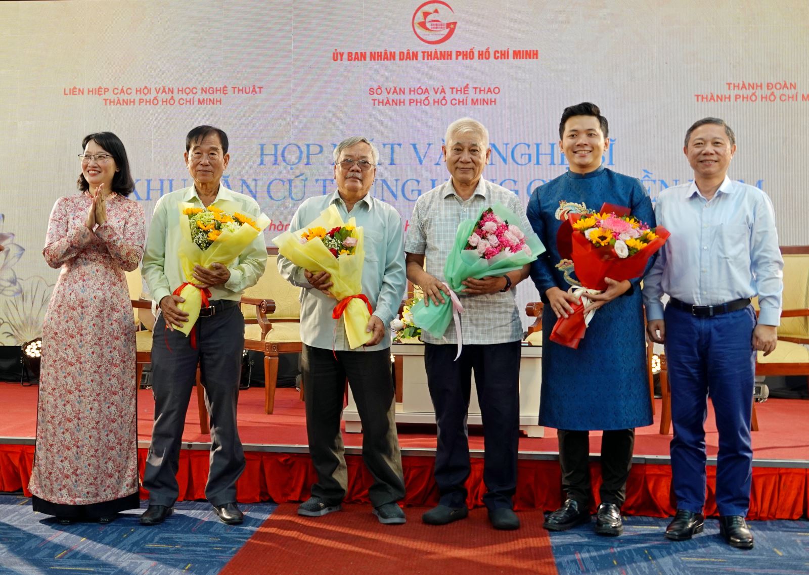 Trưởng Ban Tuyên giáo và Dân vận Thành ủy TP.HCM Dương Anh Đức và Phó Chủ tịch UBND TP.HCM Trần Thị Diệu Thúy tặng hoa các văn nghệ sĩ lão thành