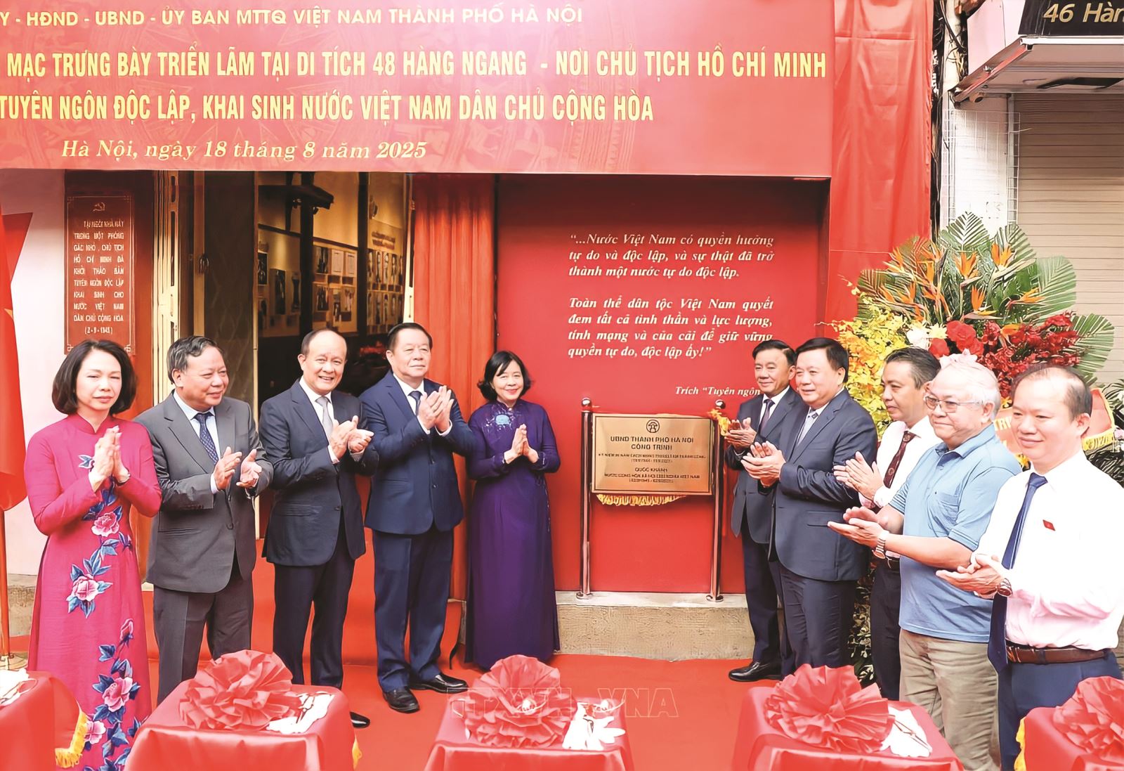 Đồng chí Trần Cẩm Tú, Ủy viên Bộ Chính trị, Thường trực Ban Bí thư cùng các đại biểu thực hiện nghi thức mở biển tại Ngôi nhà số 48 Hàng Ngang (Hà Nội) - nơi Bác Hồ khởi thảo Tuyên ngôn Độc lập tại Lễ gắn biển công trình và khai mạc trưng bày triển lãm, ngày 18/8/2025