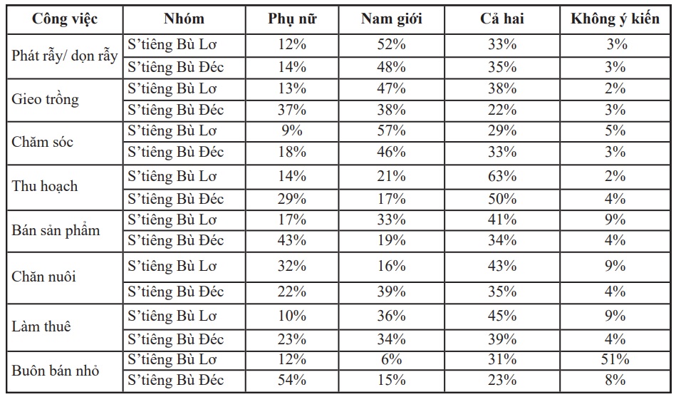 Phân công công việc trong hoạt động kinh tế hiện nay theo nhóm S’tiêng Bù Lơ và S’tiêng Bù Đéc Kết quả khảo sát tại tỉnh Đồng Nai, tháng 1-2024 - Nguồn: Tác giả
