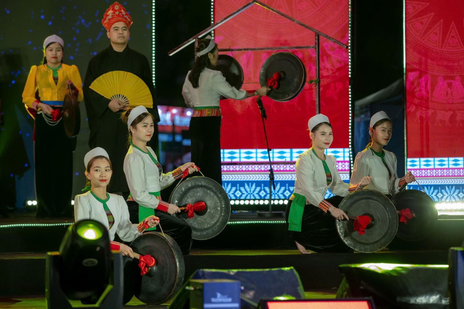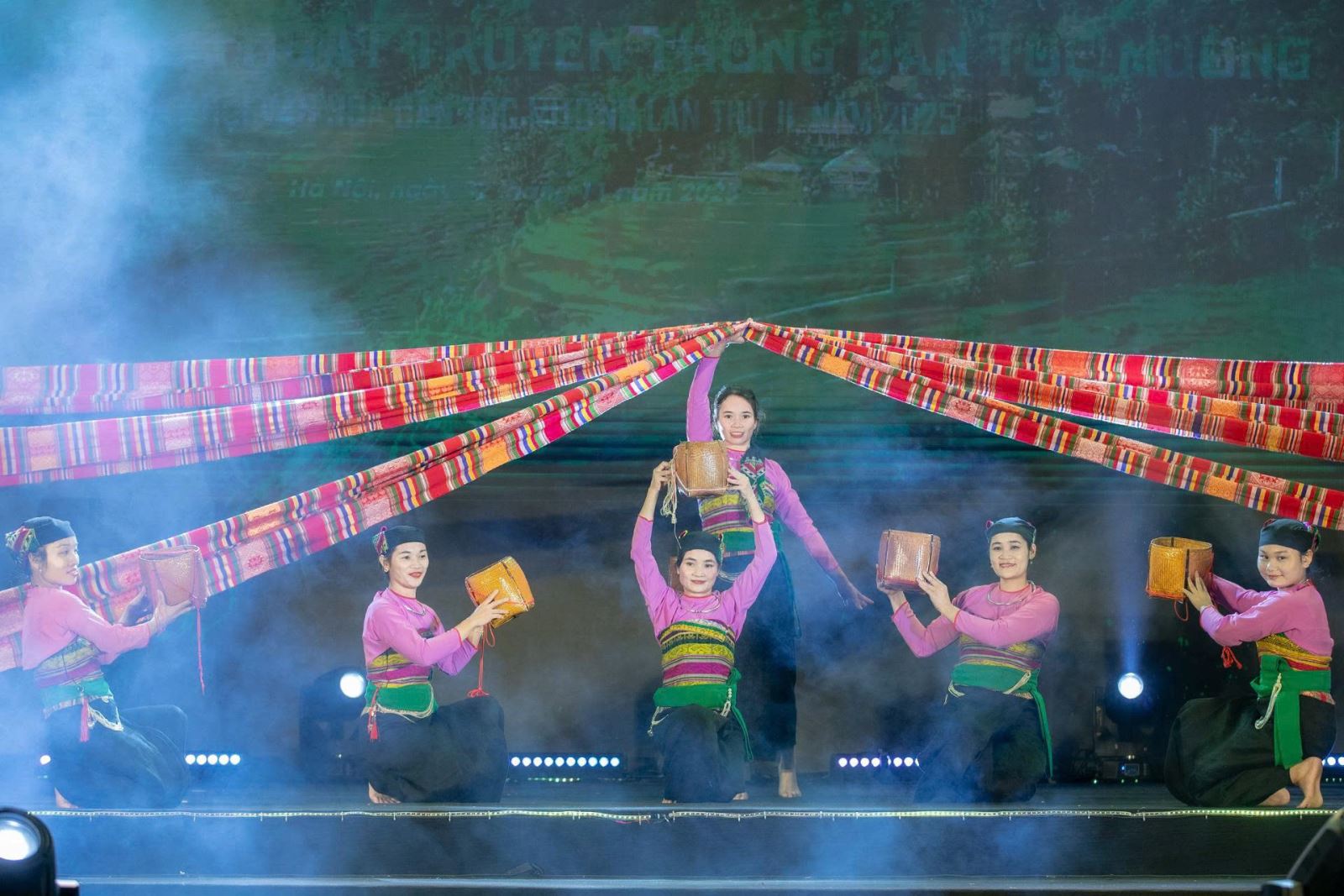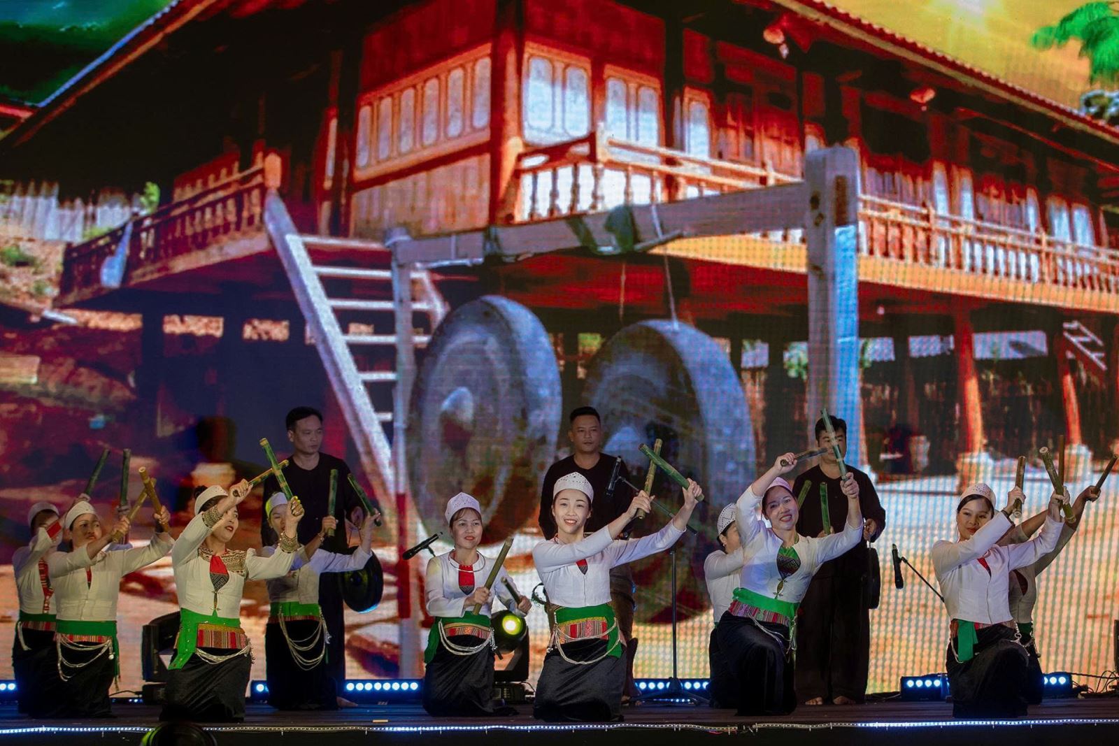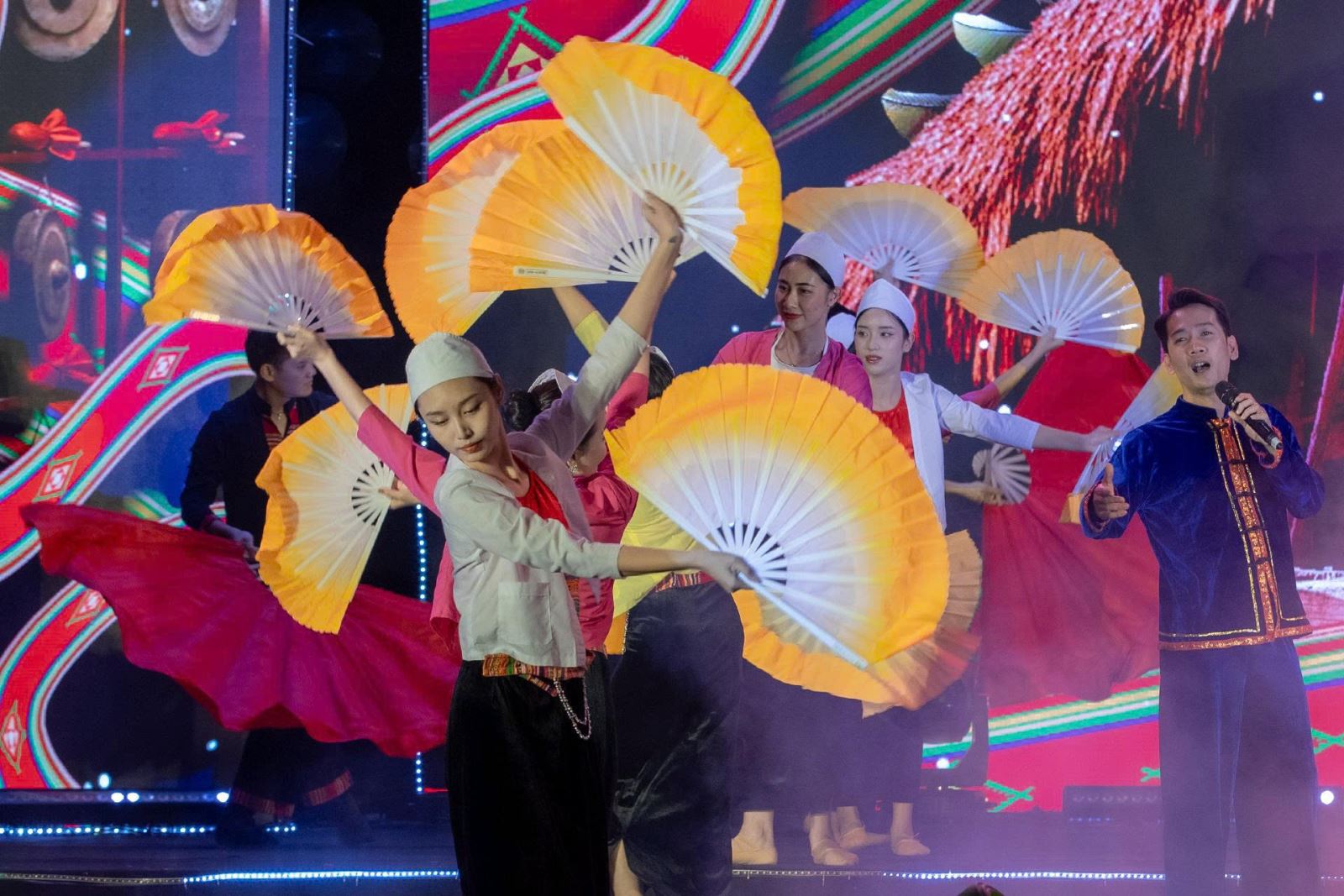Tiết mục hát múa “Tiếng cồng xứ Mường” của đoàn Sơn La vang lên như tiếng gọi từ núi rừng Tây Bắc, nơi lưu giữ những lớp trầm tích văn hóa đặc sắc của người Mường. Âm thanh cồng chiêng trầm hùng, ngân vang hòa quyện cùng tiếng hát, điệu múa đã tạo nên một không gian nghệ thuật vừa linh thiêng, vừa gần gũi.